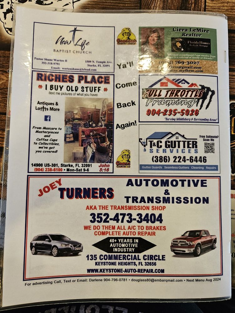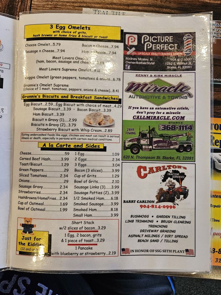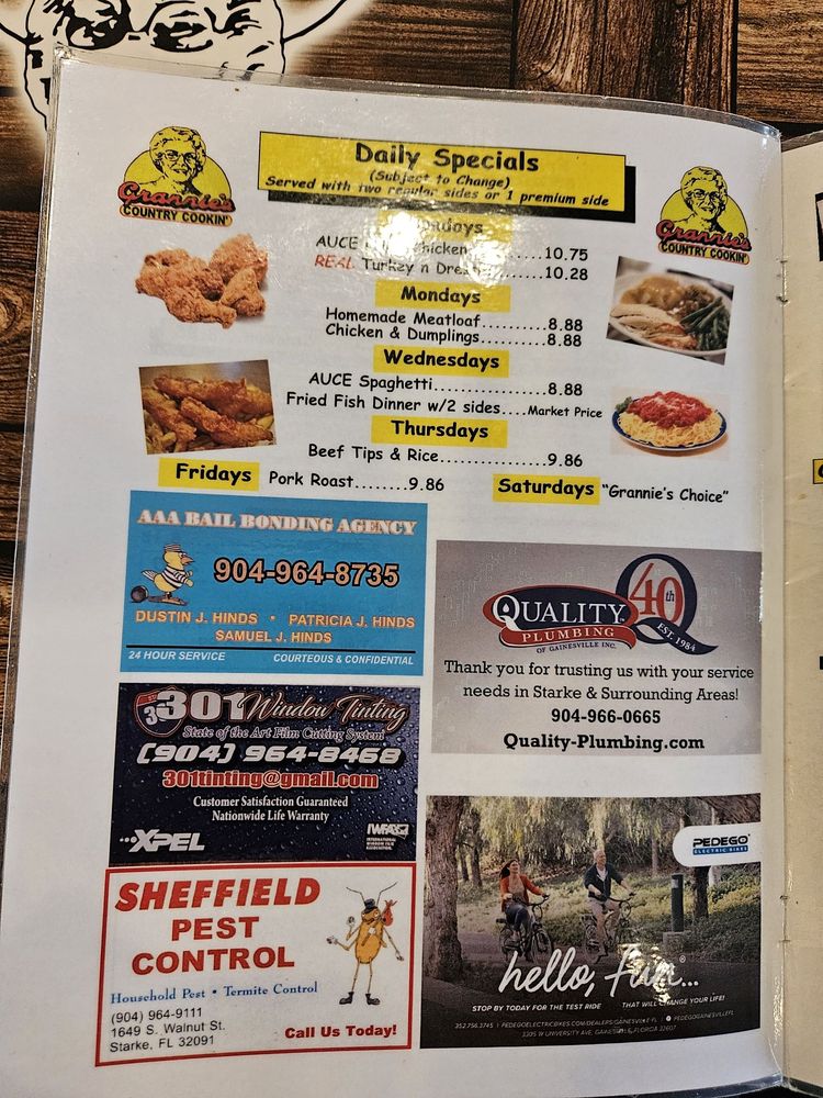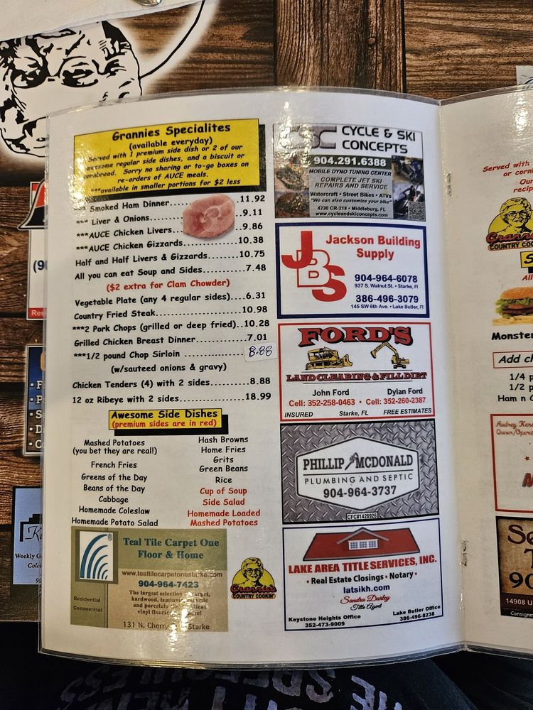 Introducing Grannie's Country Cookin, a Southern-style restaurant located in Starke, FL, known for its cozy atmosphere and delicious home-cooked meals. Offering a variety of breakfast, brunch, and lunch options, Grannie's Country Cookin is a favorite among locals and visitors alike.
